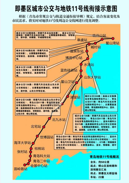 Post By:2018/4/13 15:43:12 2018年4月13號(hào),青島地鐵11號(hào)線(xiàn)正式開(kāi)始試乘。小編將帶領(lǐng)大家一起走進(jìn)青島地鐵11號(hào)線(xiàn),并將地鐵試乘體驗(yàn)分享給大家。下面先讓小編給大家簡(jiǎn)單的介紹一下青島地鐵11號(hào)線(xiàn)。 青島地鐵11號(hào)線(xiàn)是一條貫穿青島南北向交通的列車(chē),線(xiàn)路起點(diǎn)為青島市嶗山區(qū)苗嶺路和深圳路交叉口,終點(diǎn)為即墨區(qū)鰲山灣站。全程一共22個(gè)站點(diǎn),其中有10個(gè)站點(diǎn)在即墨區(qū),列車(chē)跑完全程共需58分鐘,采用里程分段計(jì)價(jià),起步價(jià)為2元,全線(xiàn)最高票價(jià)為7元。
