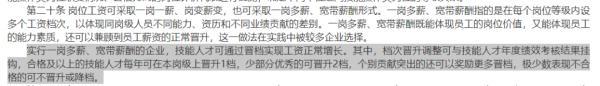 根據(jù)指引中的具體規(guī)定,崗位工資可采取一崗一薪、崗變薪變,也可采取一崗多薪、寬帶薪酬形式。其中實行一崗多薪、寬帶薪酬的企業(yè),技能人才可通過晉檔實現(xiàn)工資正常增長。