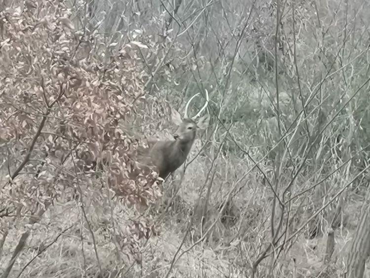 “當時我正開著車在山上四處轉(zhuǎn),突然看見側(cè)前方不到10米的距離內(nèi),驚現(xiàn)一頭鹿正在小樹林里不慌不忙地吃草,我當時非常吃驚,就趕緊拿起手機拍了下來,我看它頭上有角,肯定是一頭公鹿,目測得有200多斤重!眳秋@竹說,“我當時是在車上拍的視頻,這頭鹿大概在我視線里持續(xù)了十多分鐘,你不動它就不走,后來我下車了,它也沒走,我上前走了幾步后,它就跑了,還是怕人的,它跑的時候又同時出現(xiàn)了6頭,跟著那一頭一塊跑了!
