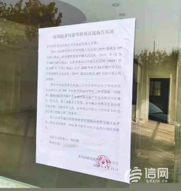 信網(wǎng)了解到,同泰華府小區(qū)于2013年11月份開盤,因開發(fā)商同泰房地產(chǎn)公司與施工方存在糾紛被法院查封,從2014年底開始該項(xiàng)目就逐漸停工建設(shè),原本約定的交房時(shí)間也被無限延期。后期經(jīng)有關(guān)部門協(xié)調(diào),2019年青島邦倬置業(yè)有限公司通過法院拍賣獲得該項(xiàng)目,并負(fù)責(zé)開工建設(shè)。2020年9月同泰房地產(chǎn)公司在項(xiàng)目現(xiàn)場(chǎng)張貼出一張告知函稱,因法院執(zhí)行決定撤銷,該公司要求青島邦倬置業(yè)有限公司3日內(nèi)撤離現(xiàn)場(chǎng)并與同泰房地產(chǎn)公司相關(guān)人員辦理交接手續(xù)。