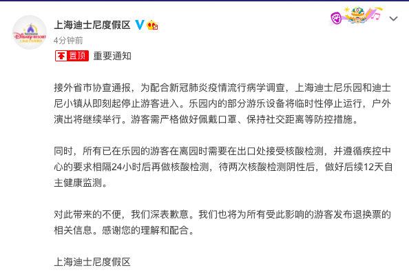 @上海迪士尼度假區(qū) 31日發(fā)布重要通知稱,接外省市協(xié)查通報(bào),為配合新冠肺炎疫情流行病學(xué)調(diào)查,上海迪士尼樂園和迪士尼小鎮(zhèn)從即刻起停止游客進(jìn)入。樂園內(nèi)的部分游樂設(shè)備將臨時(shí)性停止運(yùn)行,戶外演出將繼續(xù)舉行。游客需嚴(yán)格做好佩戴口罩、保持社交距離等防控措施。