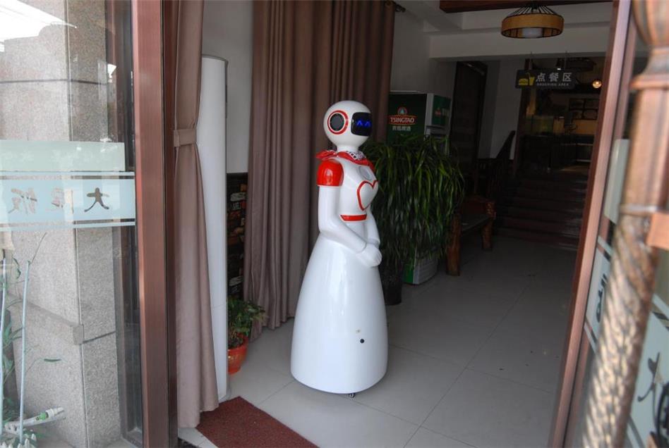 走進(jìn)餐廳大門,記者被一款俊美的機(jī)器人“攔住”!斑@是負(fù)責(zé)迎賓、送客的機(jī)器人,客人進(jìn)出時(shí)會(huì)發(fā)出‘歡迎光臨’或‘歡迎下次光臨’的聲音。”農(nóng)家樂飯店經(jīng)理丁仲青介紹。丁仲青稱,“聘請(qǐng)”機(jī)器人服務(wù)員不僅可以吸引顧客,也可以緩解餐廳生意火爆時(shí)人手不足的局面。