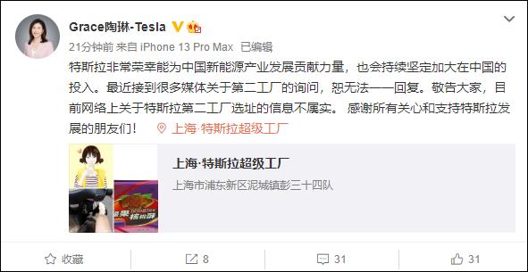 近日,網(wǎng)傳“特斯拉第二座超級(jí)工廠簽約落地青島,位置在即墨—汽大眾生產(chǎn)基地西側(cè)地塊”。對(duì)此,特斯拉對(duì)外事務(wù)副總裁陶琳今天(11月3日)傍晚在微博發(fā)文稱:“最近接到很多媒體關(guān)于第二工廠的詢問(wèn),恕無(wú)法一一回復(fù)。敬告大家,目前網(wǎng)絡(luò)上關(guān)于特斯拉第二工廠選址的信息不屬實(shí)!