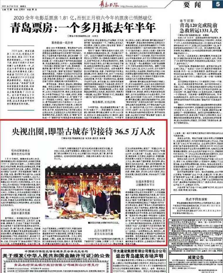 今年春節(jié),即墨憑著送選節(jié)目《牛起來(lái)》和即墨古城成功出圈,多次登上央視。在春節(jié)假期期間,即墨區(qū)舉辦了系列歡慶活動(dòng),不僅豐富了群眾的精神文化生活,也讓即墨文旅火熱起來(lái)。據(jù)了解,春節(jié)黃金周期間,在相關(guān)游覽限流措施下,即墨古城共接待入城人數(shù)36.5萬(wàn)人次。
