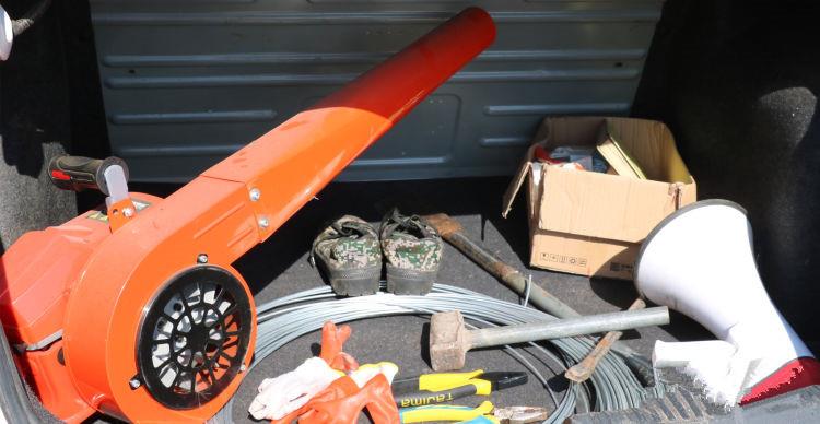 能看到,巡邏車的后備箱裝有不少裝備,其中有橡膠手套、鉗子、鐵錘、粗鐵絲、砍刀、滅火機等。據(jù)工作人員介紹,這些裝備每次巡邏必定攜帶,都能發(fā)揮重要用途。