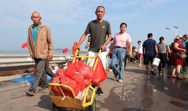 近海捕撈的漁民們都是凌晨出海,下午一點(diǎn)左右返港歸來(lái)。整座大橋擁堵的時(shí)間也自然會(huì)從下午一點(diǎn)左右一直持續(xù)到傍晚。漁民王師傅表示,出?刺鞖猓话阋辉鲁龊D苡惺颂熳笥,橋上的熱鬧場(chǎng)面和擁堵也會(huì)至少持續(xù)這些天,這種場(chǎng)面已經(jīng)持續(xù)十多年了。