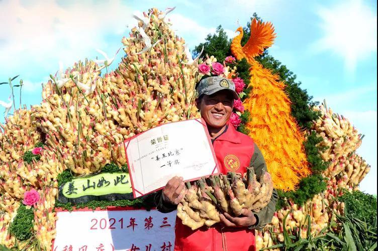 姜王評選是本次文化節(jié)的重頭戲,移風店鎮(zhèn)種植能手紛紛拿出自己的“得意之作”同臺競技。經(jīng)過一系列嚴格激烈的評選,村民李修勇憑借種植的一株重達6.33公斤的大姜,摘走“姜王”桂冠。