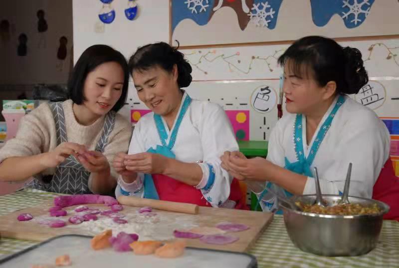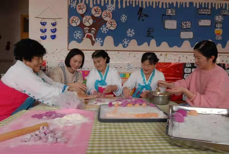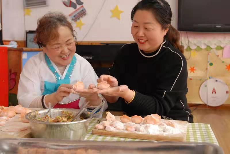 居民們分工協(xié)作,包餡、擺盤,忙得不亦樂乎,用自己拿手的方式包著各式各樣的餃子。居民和居住在本社區(qū)的朝鮮族居民們洗菜、和面、搟皮……活動現場儼然成了“歡樂大廚房”,大家分工協(xié)作,配合默契,個個動作嫻熟,一雙雙靈巧的手把濃濃的冬至情包進圓鼓鼓的餃子里。大家有說有笑,現場氣氛溫情融洽、笑語不斷,居委會里洋溢著“家”的溫馨、“家”的味道,密切了鄰里關系。你拌餡,我搟皮,一邊忙著包餃子,一邊開心拉家常,其樂融融……