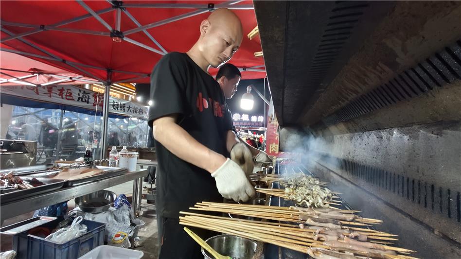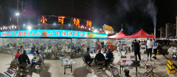 千米長的燒烤街,家家座無虛席,門前還有不少顧客正排隊等座!昂芟矚g來這里,坐著馬扎,吃著烤肉非常接地氣。”一位顧客說,氤氳的煙火氣讓他在大快朵頤同時,感受到濃濃的氛圍感。