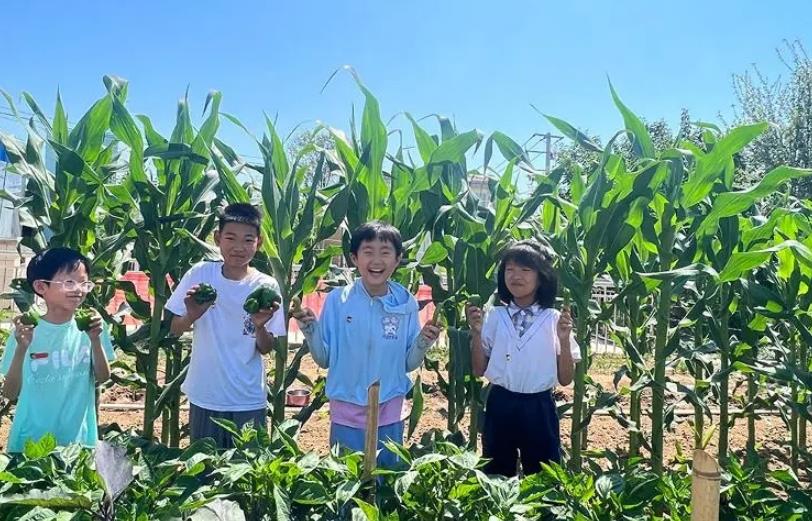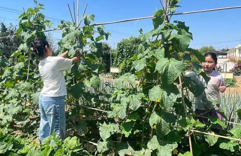 采摘時,同學們擼起袖子干勁十足。沒一會兒,一根根黃瓜、新鮮的辣椒……都被同學們摘了下來。拿著凝結著自己勞動和汗水的果實,同學們臉上都洋溢著豐收的喜悅。