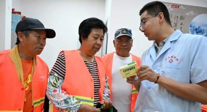 志愿者為環(huán)衛(wèi)工人送上藿香正氣水、風油精、毛巾等防暑物品。(來源:即墨區(qū)委宣傳部)