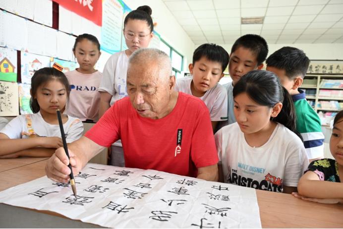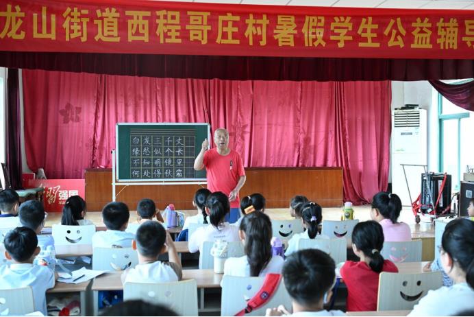 “爺爺好!”“孩子們好,請坐下!薄爸x謝爺爺!”7月16日,即墨區(qū)龍山街道西程哥莊村文化大院的暑期公益“課外輔導(dǎo)班”又開課了。在課堂上,四十多名小學(xué)生整齊端坐,目光專注地投向講臺中央。那里,90歲高齡的江敦仁老人正進行著新一年暑期公益輔導(dǎo)班的“開學(xué)第一講”。