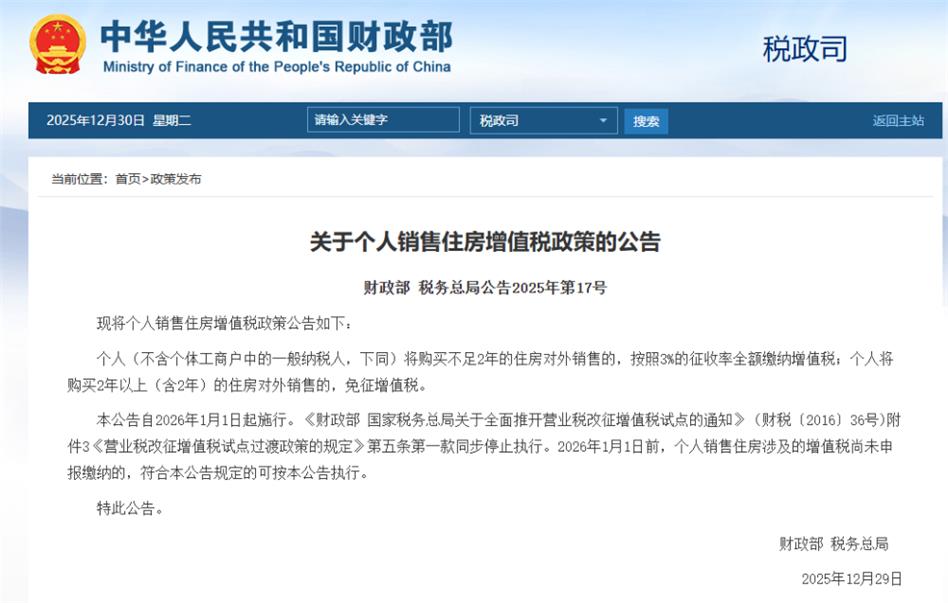 本公告自2026年1月1日起施行。《財(cái)政部 國(guó)家稅務(wù)總局關(guān)于全面推開(kāi)營(yíng)業(yè)稅改征增值稅試點(diǎn)的通知》(財(cái)稅〔2016〕36號(hào))附件3《營(yíng)業(yè)稅改征增值稅試點(diǎn)過(guò)渡政策的規(guī)定》第五條第一款同步停止執(zhí)行。2026年1月1日前,個(gè)人銷售住房涉及的增值稅尚未申報(bào)繳納的,符合本公告規(guī)定的可按本公告執(zhí)行。