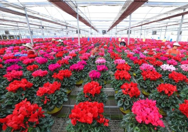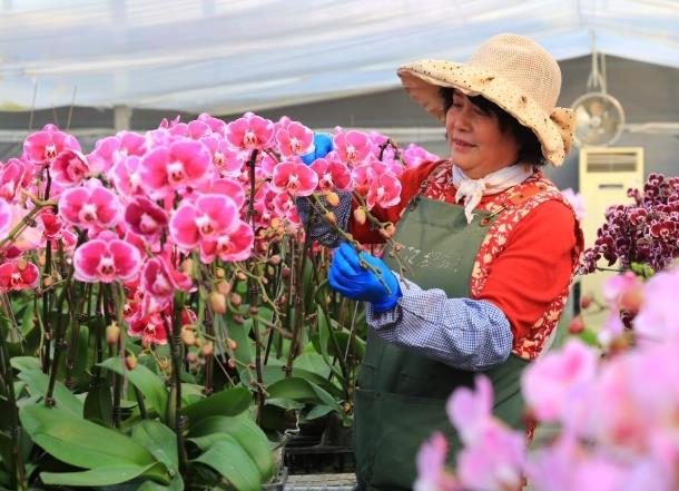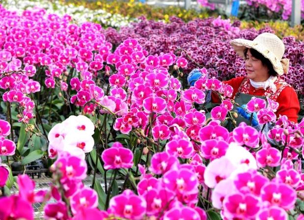 1月25日,花農在青島市即墨區(qū)靈山花卉文化產(chǎn)業(yè)園管護花卉。 春節(jié)臨近,山東省青島市即墨區(qū)靈山花卉文化產(chǎn)業(yè)園的年宵花迎來生產(chǎn)和銷售旺季,花卉大棚內的蝴蝶蘭、長壽花、仙客來等競相綻放,花農們按照訂單外運各類花卉,供應節(jié)日市場。